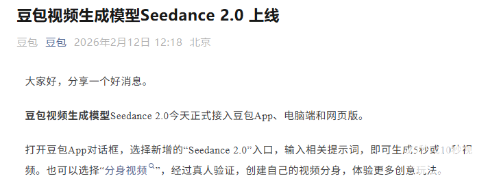 2026年2月12日,豆包宣布,豆包视频生成模型Seedance 2.0正式接入豆包App、电脑端与网页版,面向全部用户开放使用。