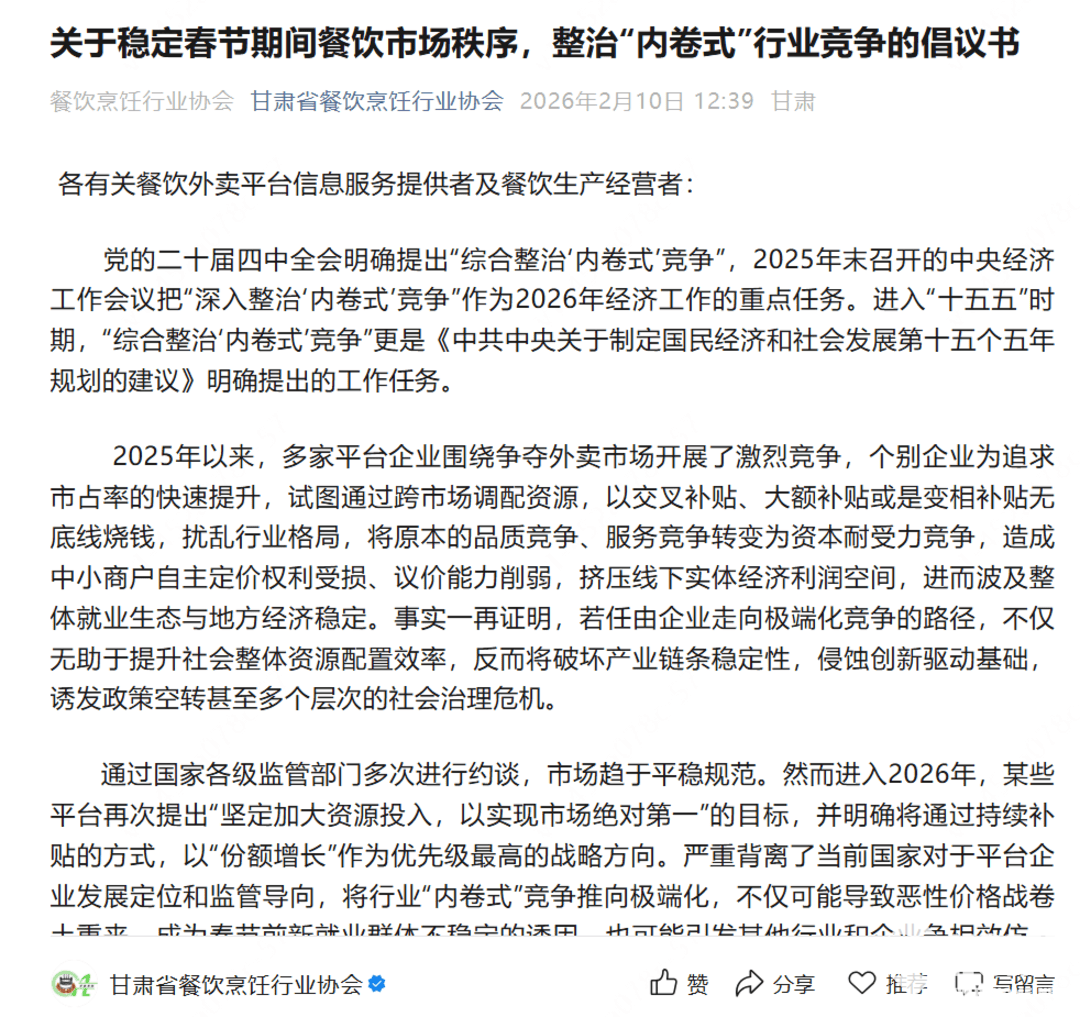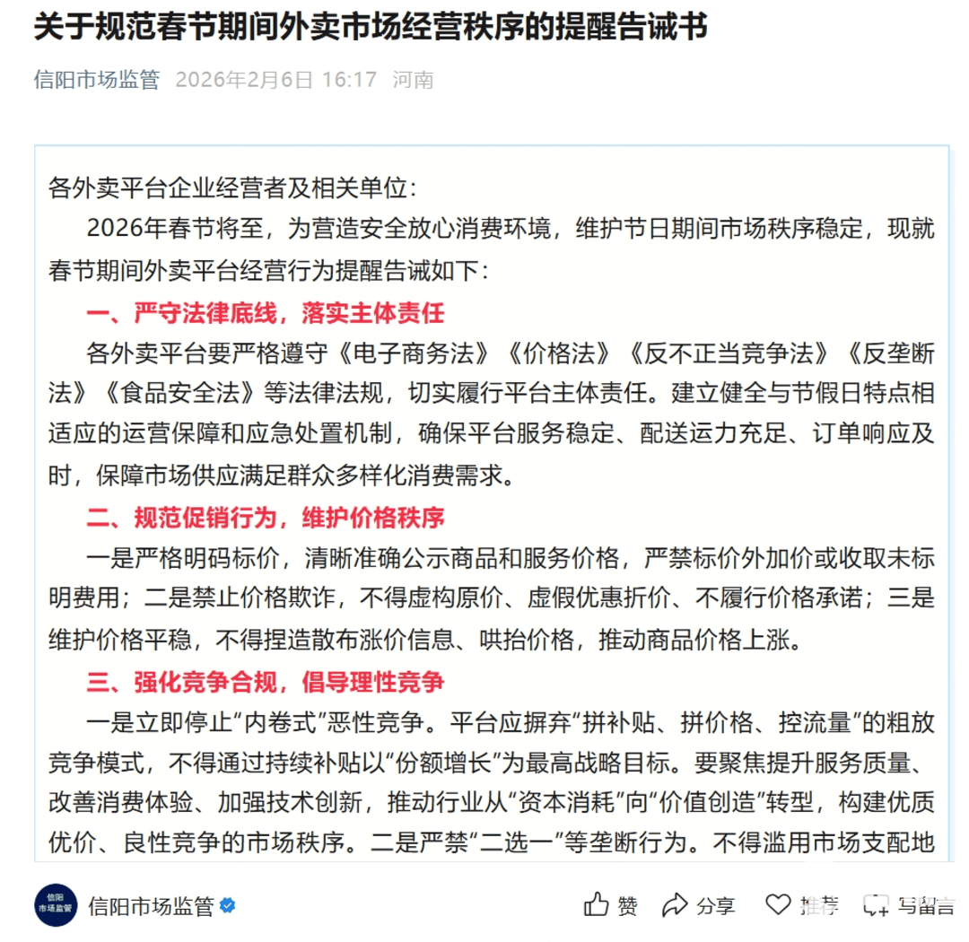 2026年2月13日消息,近期,全国多地市场监管部门发布合规指引与告诫,要求外卖平台立即停止低质低价“内卷式”恶性竞争,规范定价与促销行为,维护春节期间外卖餐饮市场秩序,保障商家、骑手与消费者三方合法权益。