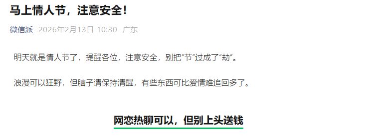 2026年2月13日,在情人节来临之际,“微信派”公众号发布安全提醒,在网络交友时切勿上头转账,守住资金与信息安全,别把“节”过成了“劫”。