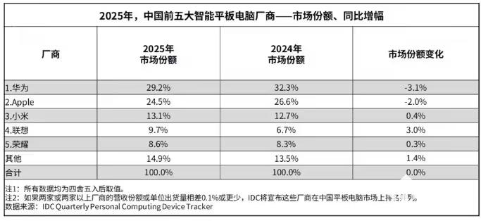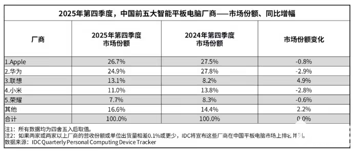 2026年2月13日,国际数据公司(IDC)发布2025年中国平板电脑市场年度报告与第四季度季度跟踪报告。全年市场出货量达3376万台,同比增长13.1%;第四季度出货量同比增长 7.2%。
