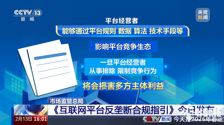 2026年2月13日,市场监管总局发布《互联网平台反垄断合规指引》,针对平台经济发展特点细化反垄断合规规则,明确将“二选一”行为列入新型垄断风险场景,为互联网平台经营者划定清晰竞争红线。