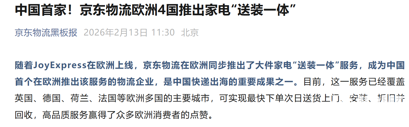 2026年2月14日消息,“京东物流黑板报”公众号宣布已在英国、德国、荷兰、法国等欧洲多国的主要城市同步推出了大件家电“送装一体”服务,成为中国首个在欧洲落地该服务的物流企业,是中国快递出海的重要成果之一。