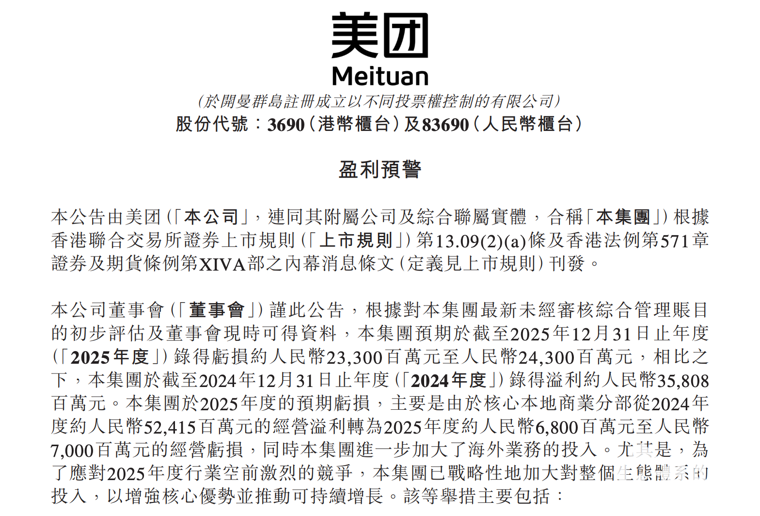 这也是美团核心本地商业板块多年来首次出现年度经营亏损,该板块2024年尚有524.15亿元经营溢利,2025年则转为68亿元至70亿元的亏损。