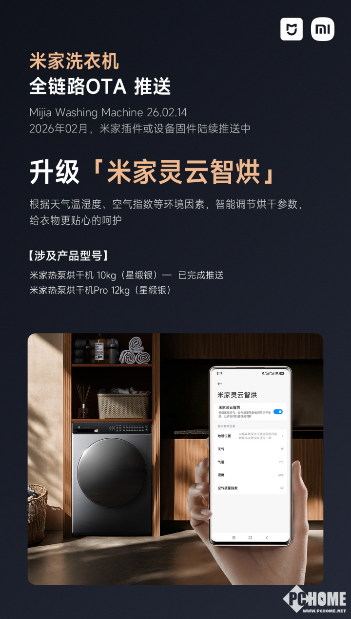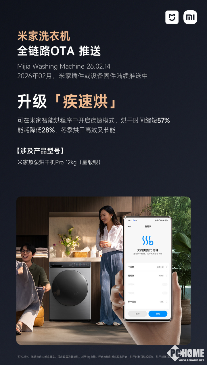 2026年2月14日消息,小米宣布米家洗衣机启动OTA升级,陆续推送至多款支持设备,本次升级重点提升洗烘效率与衣物护理体验。