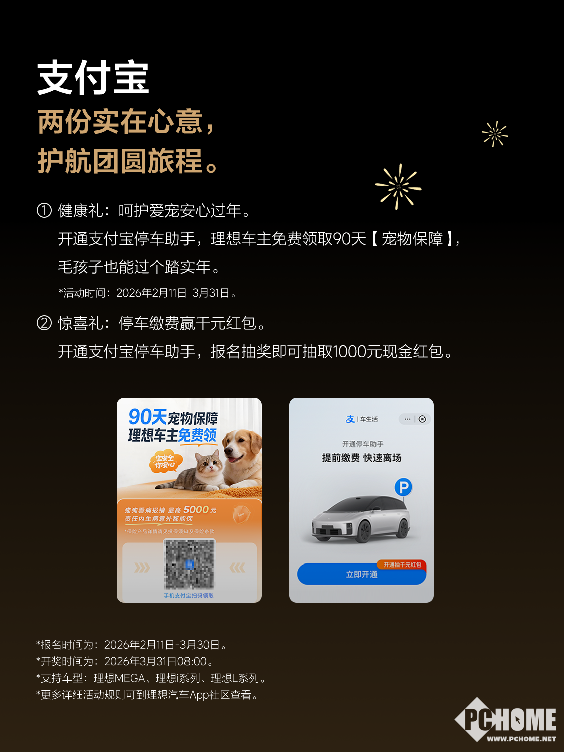 出行与养车方面,支付宝推出双重权益:开通停车助手的理想车主可免费领取90天宠物保障(2月11日-3月31日),同时可参与千元停车红包抽奖(报名截止3月30日);美团则提供60元用车保养券(2月7日-3月7日),车主登录车机美团应用即可一键领取,轻松预约洗车养护服务。