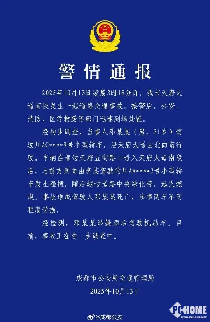 事故发生于2025年10月13日凌晨3时18分,邓某某驾驶小米SU7 Ultra沿天府大道行驶,与前车发生碰撞,越过绿化带后起火燃烧,造成邓某某身亡、两车受损。调查显示,车辆碰撞前时速超200km/h、撞击时车速超160km/h,远超该路段80km/h的限速,加以邓某某酒后驾驶,最终导致悲剧发生。