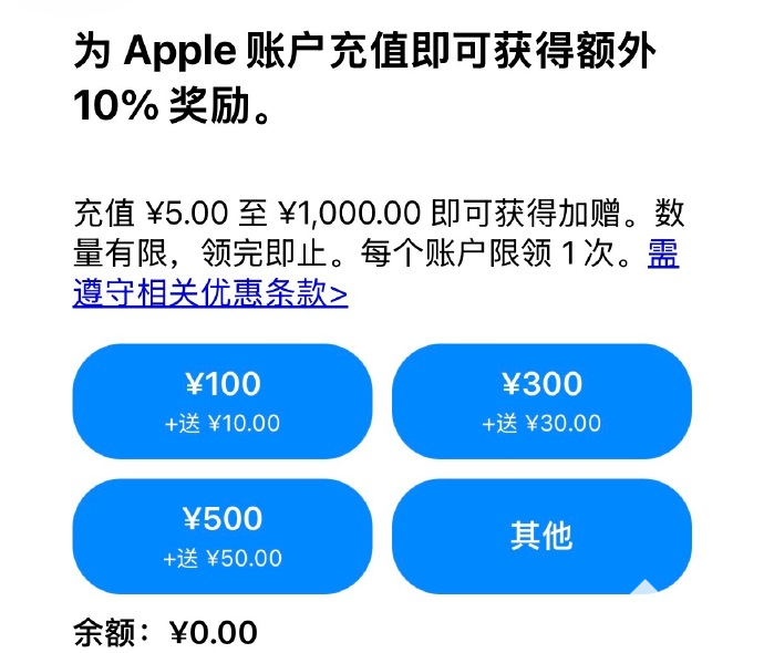 2026年2月14日消息,苹果App Store中国大陆地区上线账户限时充值加赠优惠活动,用户为Apple ID充值可享10%额外金额奖励,最高充1000元送100元,活动限量40万次。