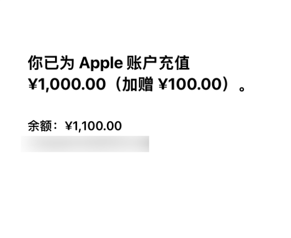 本次活动将按固定比例加赠,可自行充值5-1000元:充值100元赠10元、300元赠30元、1000元赠100元。赠送金额将直接计入账户余额,可用于App与游戏购买、Apple Music、iCloud服务等苹果生态消费。
