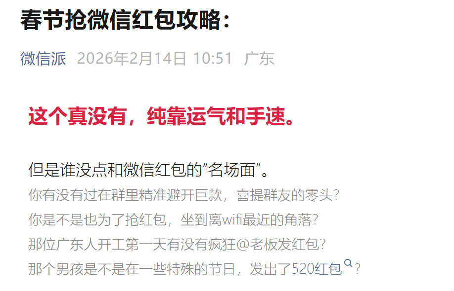 2026年2月14日,“微信派”公众号发布《春节抢微信红包攻略》,并邀请微信支付产品经理针对微信红包相关问题进行答疑。