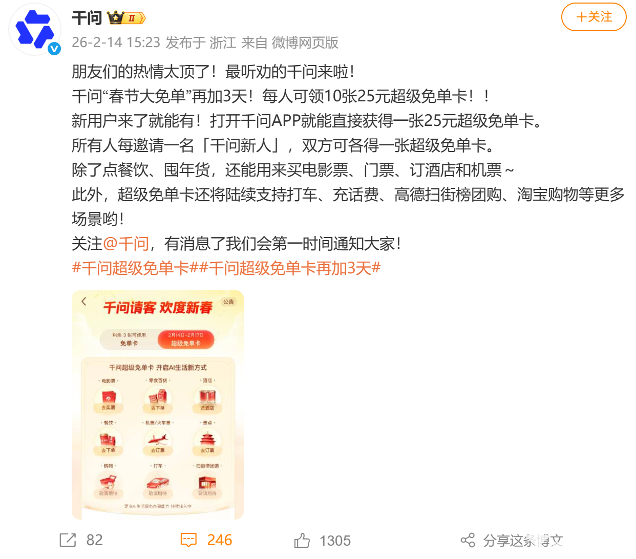 2026年2月14日,阿里千问正式宣布,“春节大免单”活动再加三天,每人最高可领取10张25元超级免单卡。
