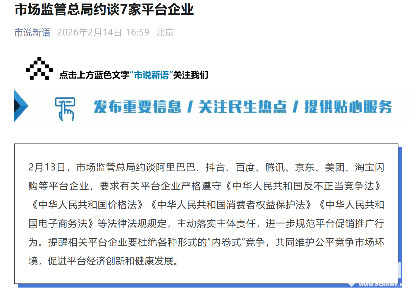 2026年2月14日,国家市场监督管理总局于昨日约谈阿里巴巴、抖音、百度、腾讯、京东、美团、淘宝闪购等7家重点平台企业,针对平台促销推广行为提出合规要求。