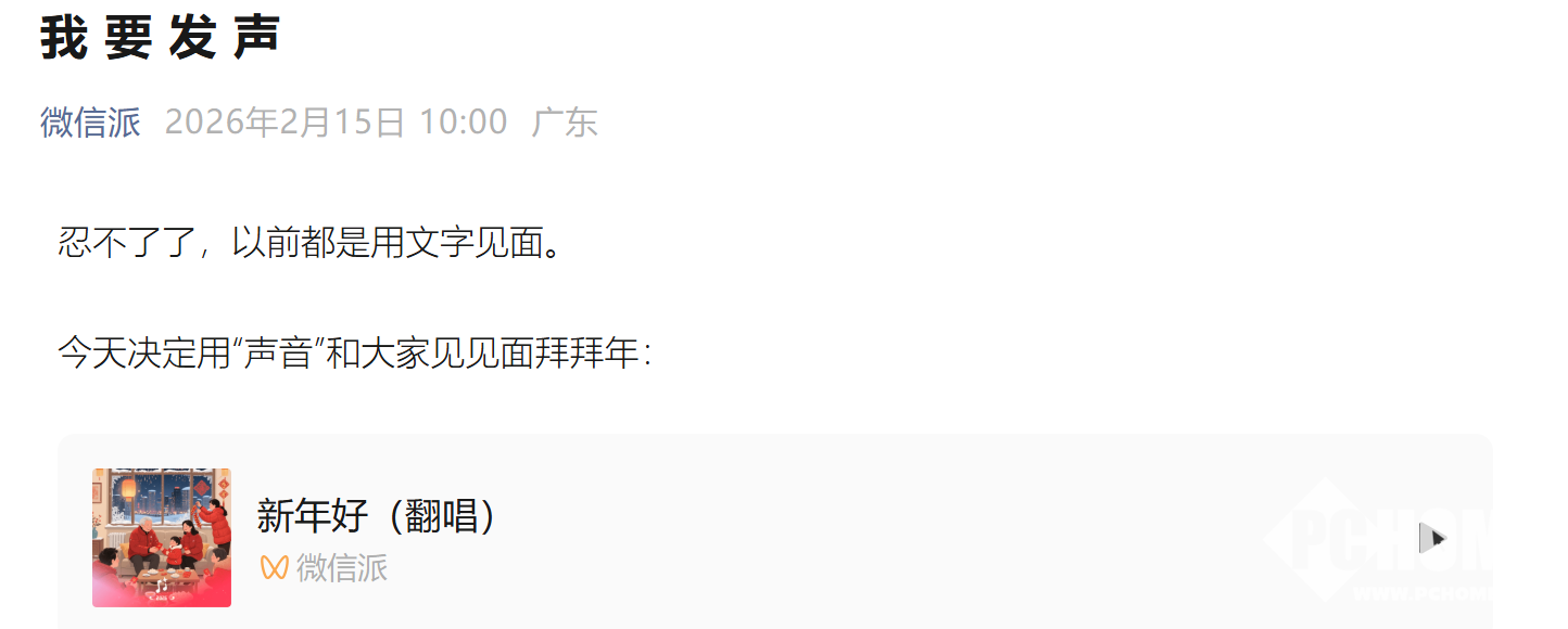 2026年2月15日,“微信派”公众号发文宣布上线春节特色功能,用户可通过AI技术,用自己的声音一键生成专属拜年歌曲。