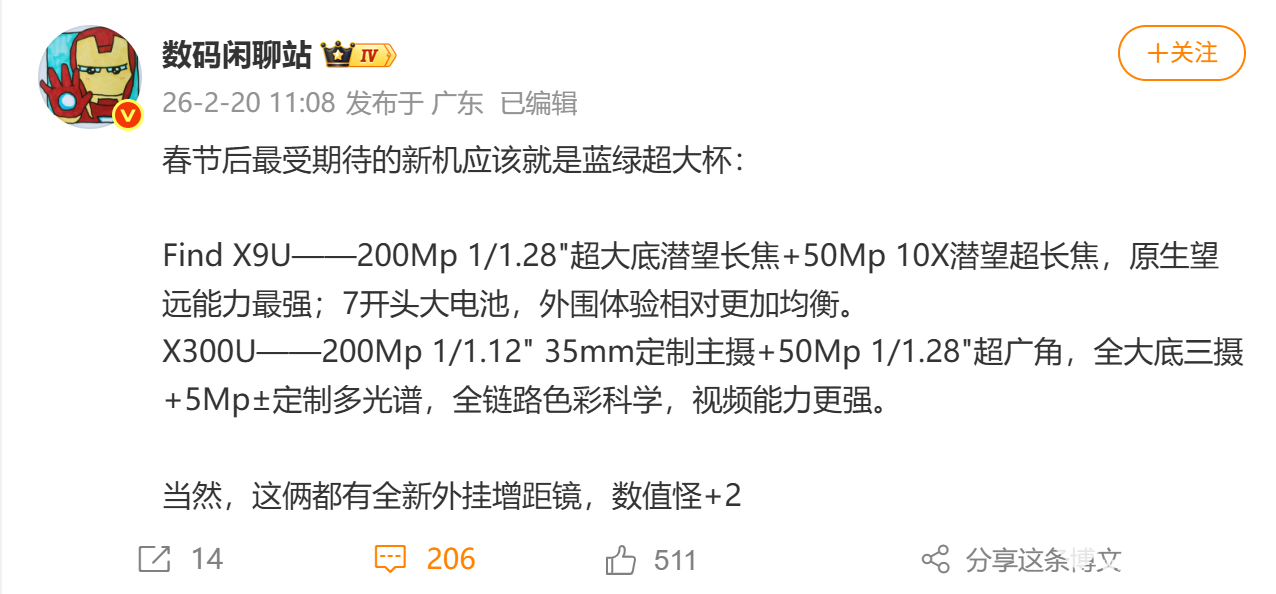 2026年2月20日,据博主“数码闲聊站”发文称,OPPO Find X9 Ultra与vivo 300 Ultra即将推出全新外挂增距镜配件,两款新机均预计春节后3月正式发布。