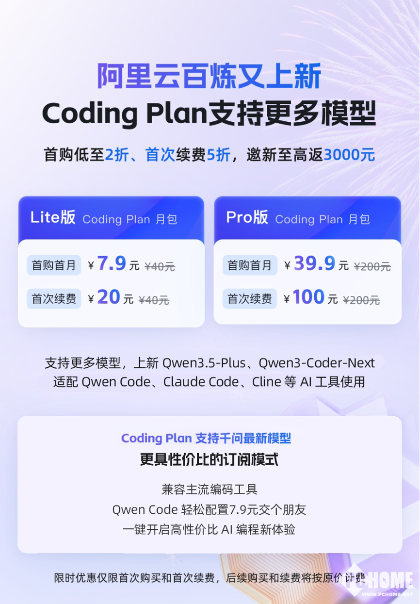 同时,用户可在Qwen Code、Claude Code、Cline、OpenClaw等主流AI工具使用阿里云Coding Plan订阅服务。