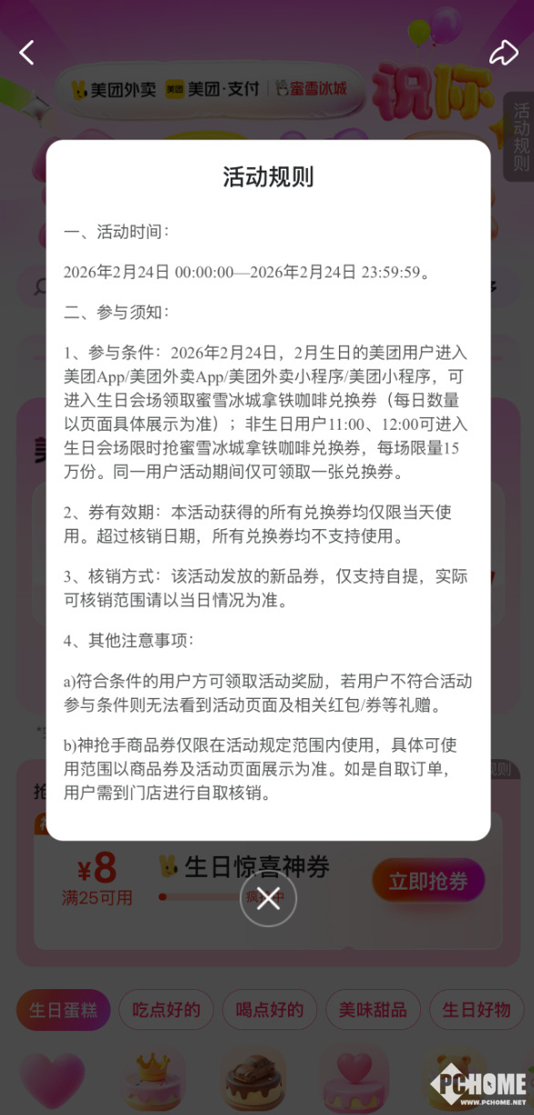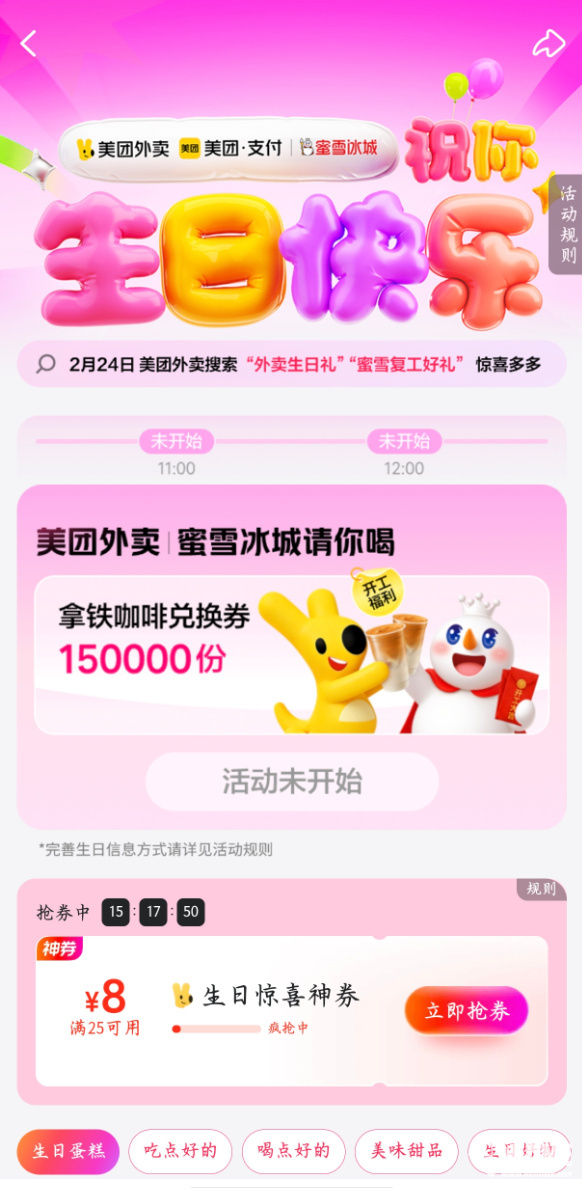 2026年2月24日,美团外卖联合蜜雪冰城开启“团团×雪王送生日福利 复工‘铁’定行”主题活动,为2月生日用户送上专属免单惊喜,同时面向全国用户派送百万份奶茶免单福利。