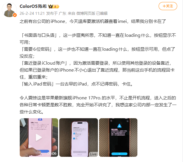 2026年2月24日,OPPO ColorOS设计总监陈希在微博发文公开吐槽苹果最新旗舰iPhone 17 Pro,称该机在激活、系统操作等环节频繁卡顿,直言“完全开始不讲究了”。