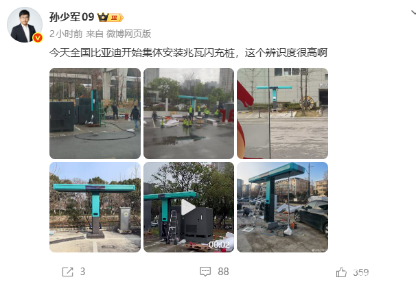2026年2月24日,据博主“孙少军09”爆料,比亚迪于今日开始在全国集体安装兆瓦闪充桩。