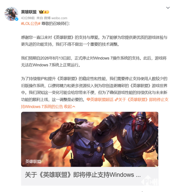 2026年2月24日消息,《英雄联盟》官方今日正式宣布,将于2026年8月13日起停止对Windows 7操作系统的支持,此后游戏将无法在该系统上运行。