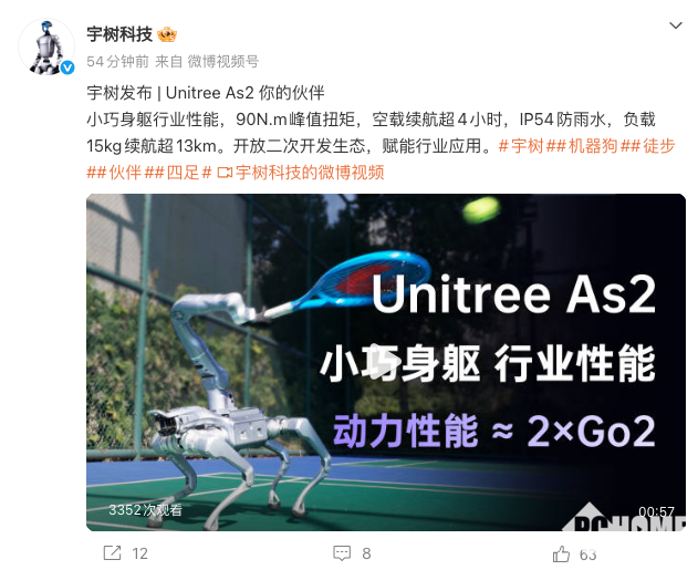 宇树发布四足机器人Unitree As2:空载续航超4小时,IP54防雨水