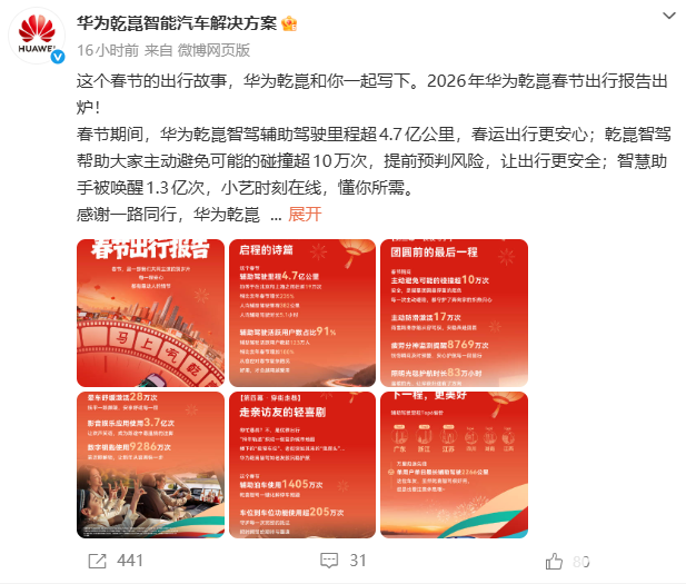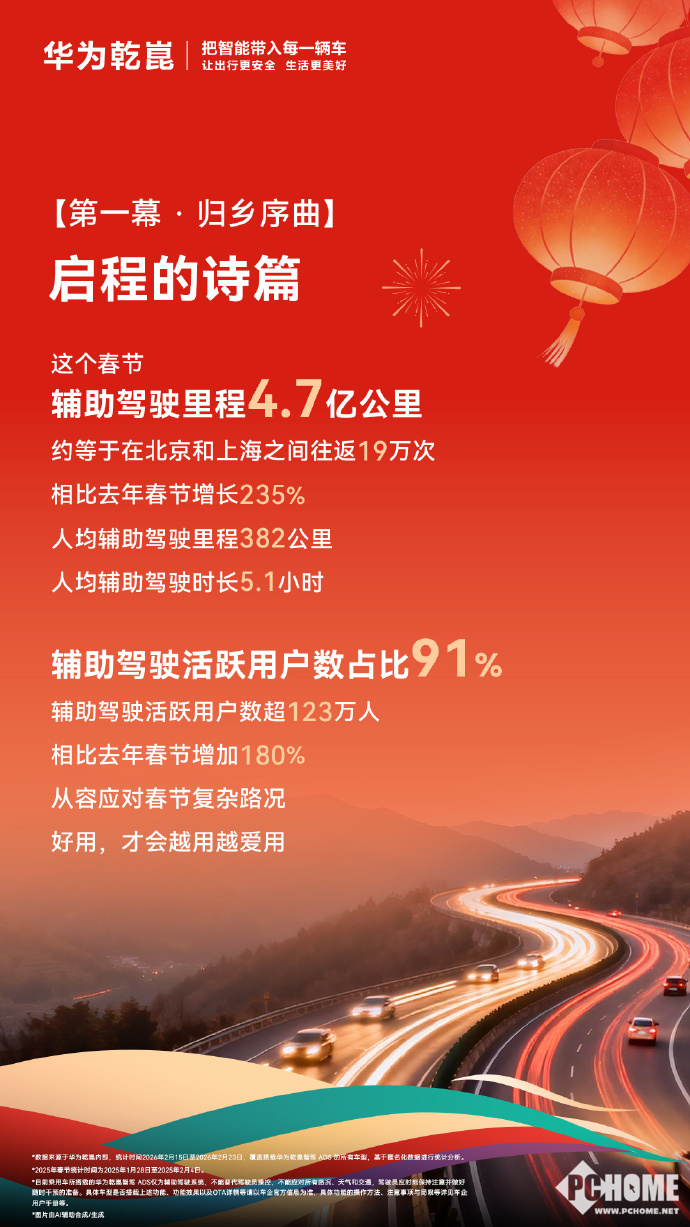 2026年2月25日消息,华为乾崑智能汽车解决方案官方微博于昨日发布了春节出行报告,假期内辅助驾驶累计里程超4.7亿公里,约等于在北京和上海往返19万次,较去年春节增长235%。