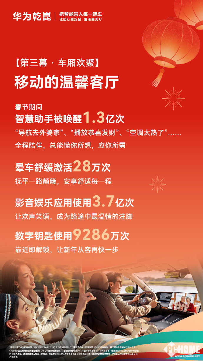 与此同时,乾崑智驾用户的活跃度也大幅增长,辅助驾驶活跃用户超123万人,用户占比达91%,同比增长180%;人均辅助驾驶里程382公里,人均使用时长5.1小时。在安全防护方面,春节期间,乾崑智驾主动避免潜在碰撞超10万次,主动防滑功能被激活17万次,有效应对雨雪、拥堵、施工等复杂路况,大幅降低事故风险。智慧助手小艺被唤醒1.3亿次,以语音交互、场景化服务提升旅途便捷性。