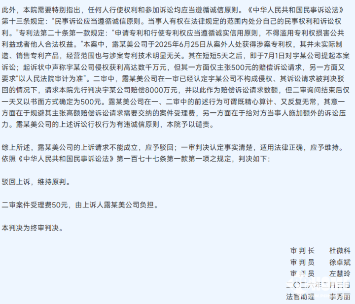 2026年2月25日消息,近期,最高人民法院在一起“电子狗”专利侵权纠纷案的终审判决中,对原告杭州露韦美公司进行了严厉谴责:“其行为可谓既精心算计、又反复无常。”