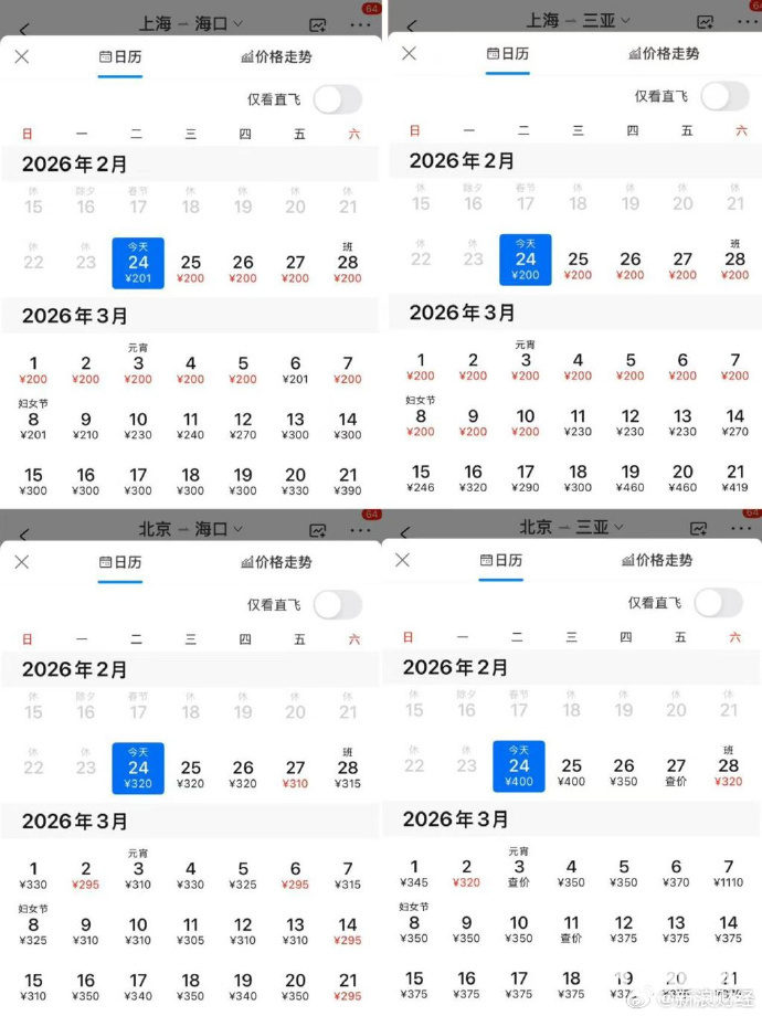 据多家平台2月24日数据,北京—三亚均价约585元,较春节下降66%、北京—海口约527元,降幅58%、上海—三亚约479元,降幅63%、上海—海口约410元,降幅61%,成都、重庆、深圳等城市飞往海南多条航线均价跌破500元,最低238元。