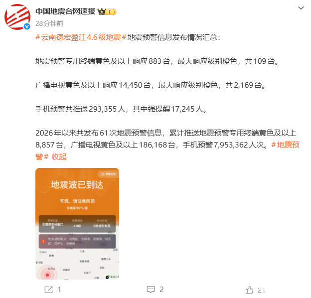 2026年2月25日消息,中国地震台网正式测定,于今日11时15分,云南德宏州盈江县发生4.6级地震,震源深度10公里,腾冲、芒市、瑞丽等周边多地有明显震感。本次地震共触发手机预警推送超29万人,其中强提醒17245人。