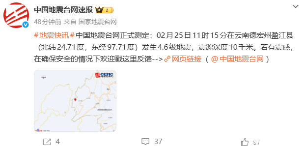 2026年2月25日消息,中国地震台网正式测定,于今日11时15分,云南德宏州盈江县(北纬24.71度,东经97.71度)发生4.6级地震,震源深度10公里。腾冲、芒市、瑞丽等周边多地有明显震感。