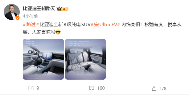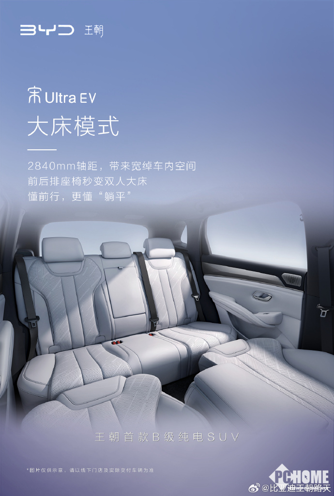 2026年2月25日,比亚迪王朝网销售事业部总经理路天在微博公布了一组王朝首款B级纯电SUV宋Ultra EV的内饰图,新车主打“松弛有度,悦享从容”的座舱体验,其前后排座椅秒变双人大床模式成为最大亮点。