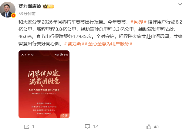 2026年2月25日,赛力斯集团副总裁康波在微博正式发布了2026问界汽车春节出行报告,2月14日-2月23日春节期间问界用户累计行驶8.2亿公里,增程里程3.8亿公里;辅助驾驶总里程达3.3亿公里,占比46.6%;辅助驾驶活跃用户超71万,占比81.8%。