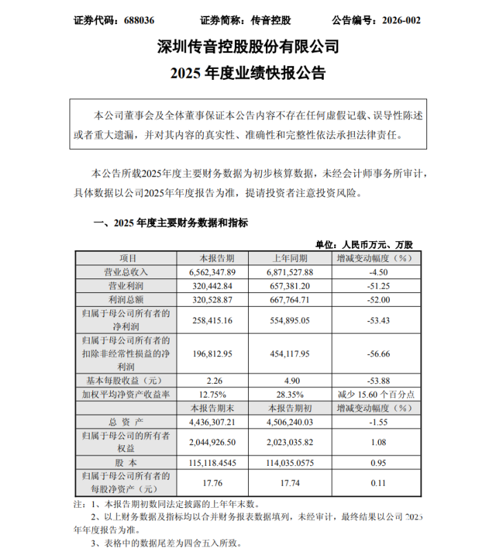 2026年2月26日,素有“非洲手机之王”之称的传音控股发布2025年度业绩快报,公司全年经营业绩出现显著下滑,核心盈利指标跌幅超五成。