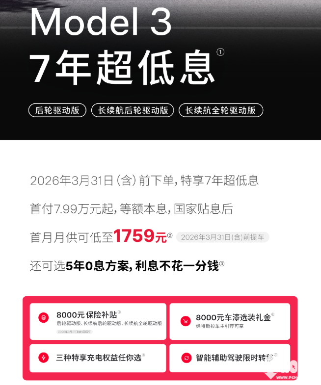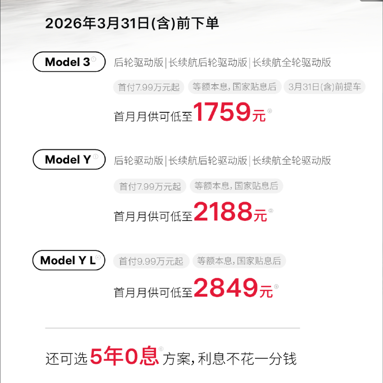 根据官方信息,活动有效期至3月31日(含),Model 3首付7.99万元起,7年月供低至1759元;Model Y首付7.99万元起,月供低至2188元;Model Y L首付9.99万元起,月供低至2849元。此外,Model 3的指定版本可享8000元限时保险补贴,可与优惠政策叠加使用。