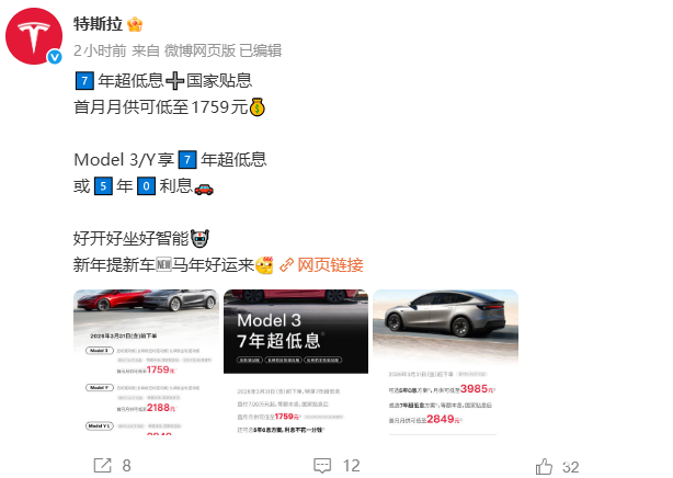 2026年2月26日,特斯拉中国推出限时购车优惠政策,面向Model 3、Model Y、Model Y L主力车型提供5年0息与7年超低息双重金融方案,同步叠加保险补贴后,进一步降低购车门槛。