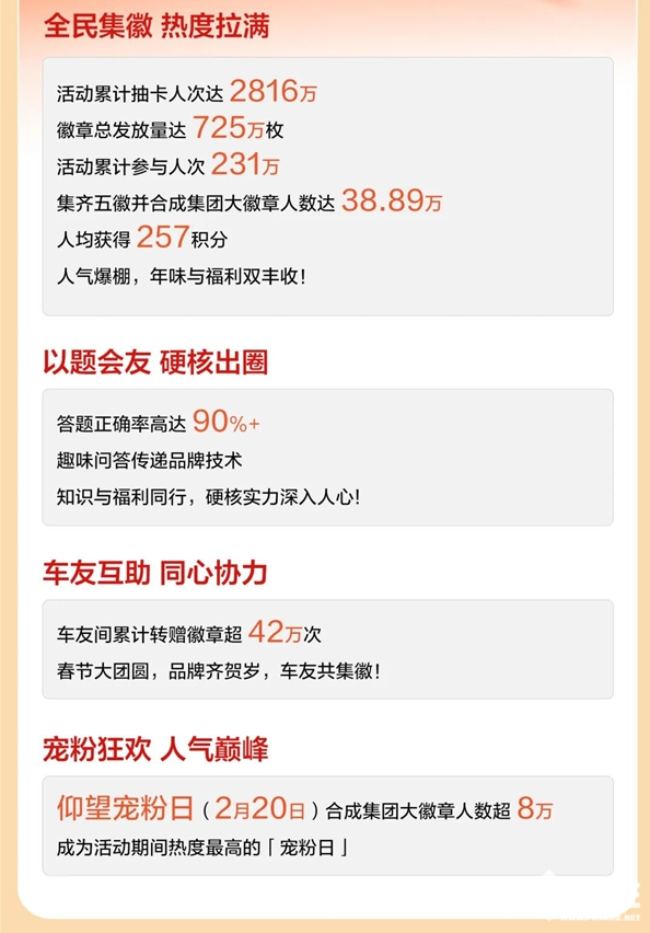 2026年2月26日,比亚迪宣布马年集五徽新春活动圆满收官,官方发布的数据显示,活动累计参与人次达231万,最终38.89万用户成功集齐徽章,共同瓜分1亿积分。