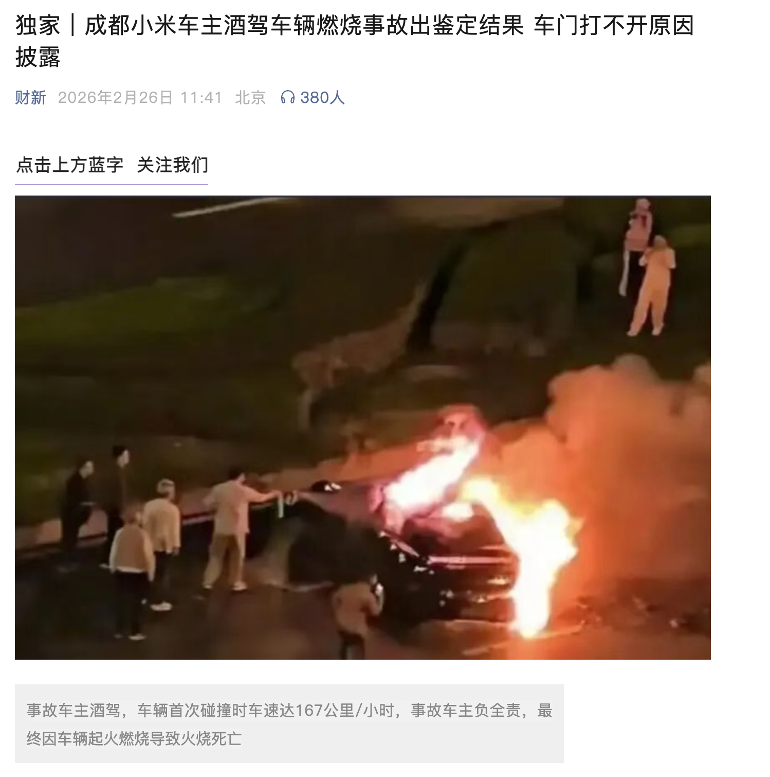 近日,财新网曝光了成都小米汽车碰撞燃烧事故责任认定报告复议结果,车门打不开以及车主死亡的原因均被披露。