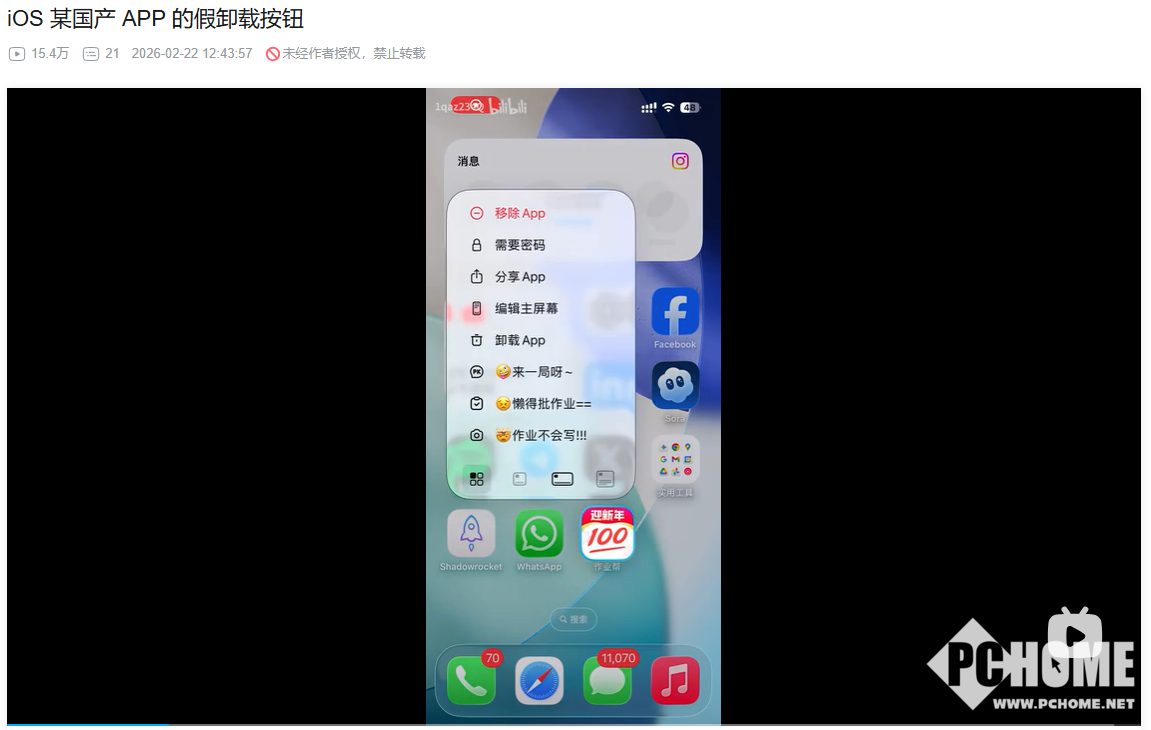 近日,有B站UP主实测发现,iOS版作业帮App在长按快捷菜单中,擅自添加虚假卸载按钮,误导用户操作、阻碍正常卸载,引发大量用户不满。