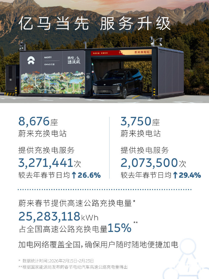2026年2月26日,蔚来汽车正式发布2026年春节假期(2月15日-2月23日)用户加电报告。假期内蔚来全国补能网络累计提供换电服务207.35万次,同比去年春节上涨29.4%;提供充换电服务总量达327.14万次,同比日均增长26.6%。