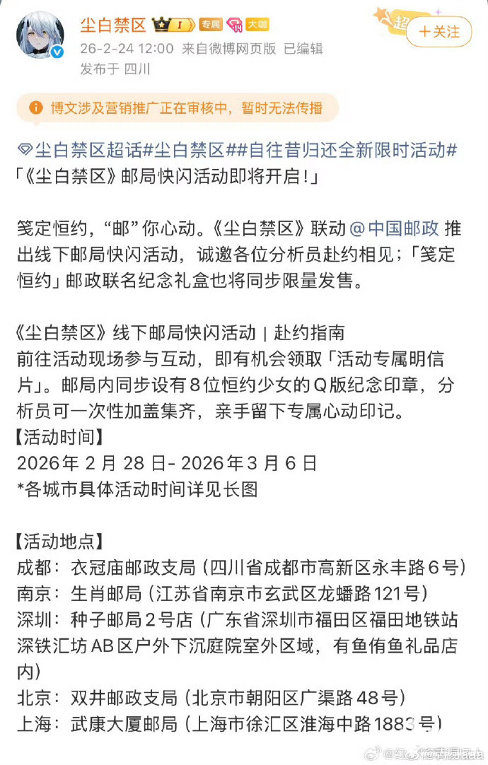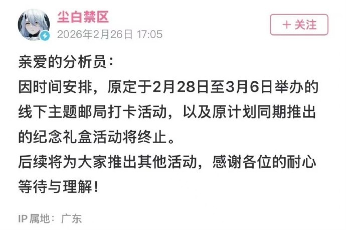 事件发酵后,中国邮政已紧急终止全部相关线下联动活动。截至目前,仅确认活动终止,中国邮政官方未发布详细说明与致歉;《尘白禁区》官方尚未就尺度争议进行公开回应。