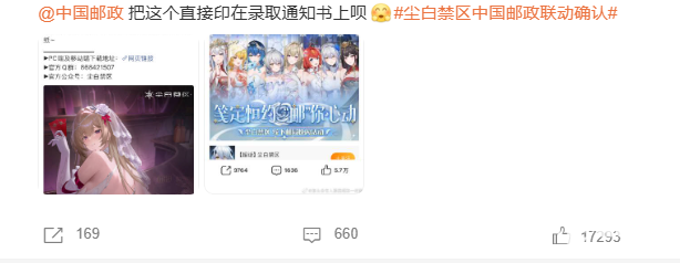 2026年2月26日,手游《尘白禁区》官宣与中国邮政开展线下联动快闪活动,计划在北京等多地邮政网点举办主题活动、发售联名周边等,但因游戏内容尺度过大、形象擦边,遭到大量网友抵制与投诉,相关话题迅速登上热搜。