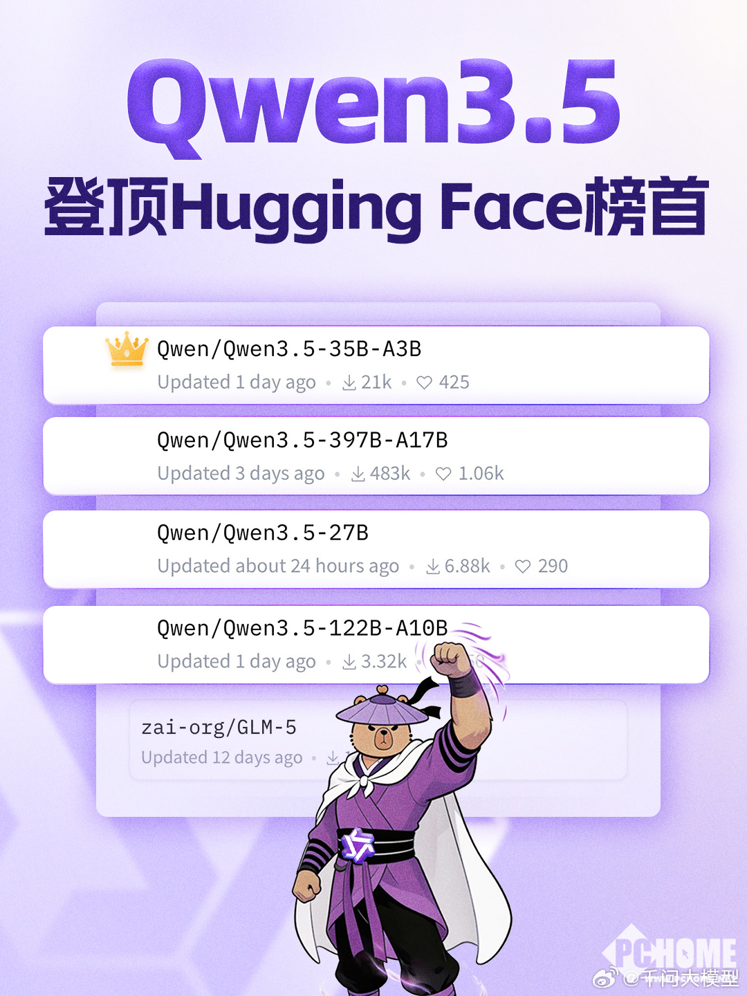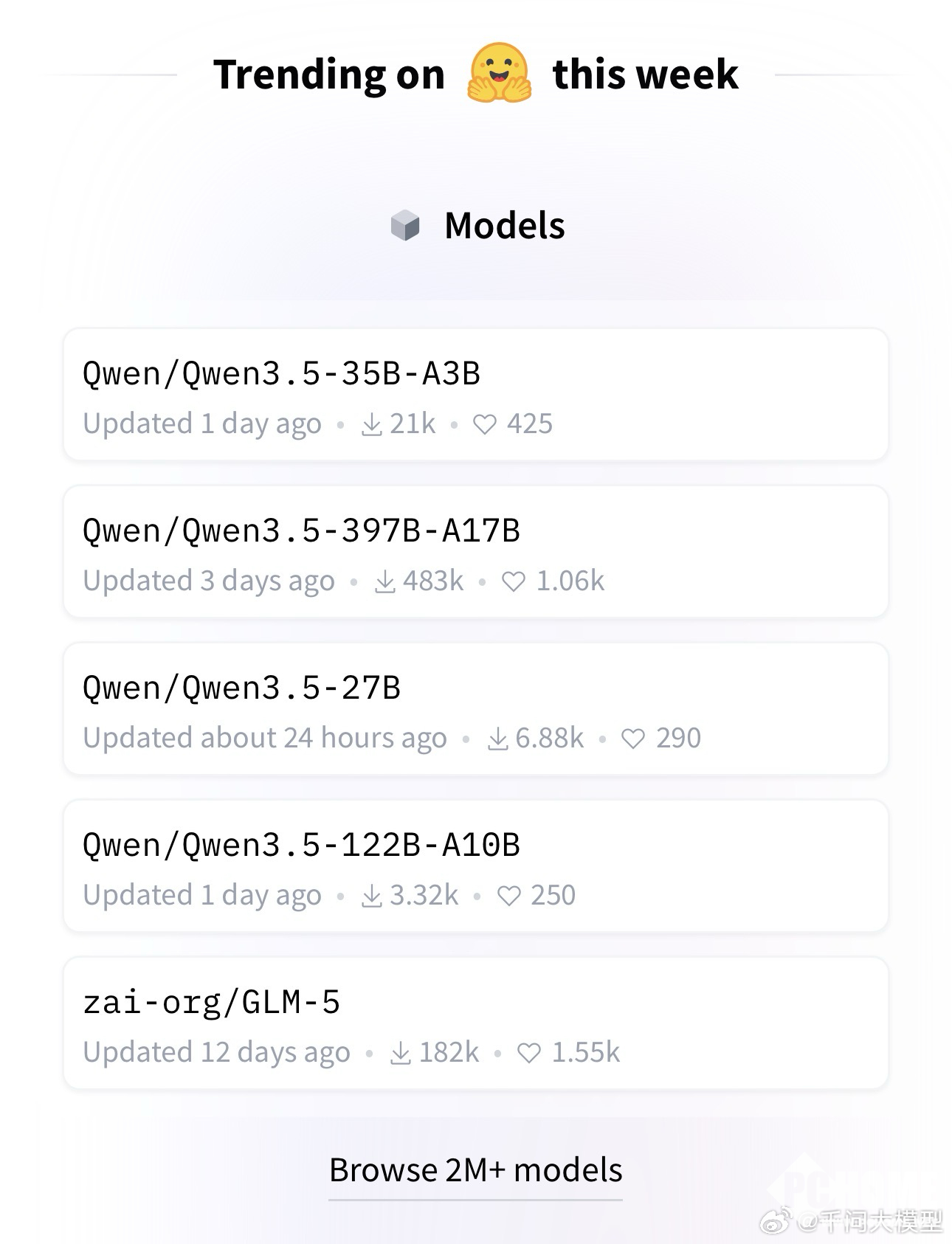 PChome 2月27日消息,Qwen3.5系列模型上线短短时间,就包揽Hugging Face趋势榜TOP5中的4席,其中Qwen3.5-35B-A3B在不到发布24小时内成功登顶。