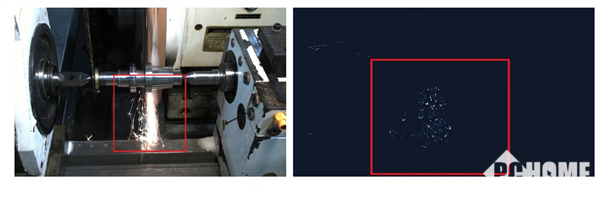 成像示例2:金属切割过程中的火花检测(左:基于帧的图像,右:事件监测的传感)
