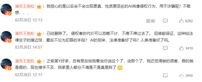 事发后,王劲松立即向平台投诉举报,并在评论区晒出投诉截图,涉事视频现已被平台下架删除。他在互动中坦言,逼真的AI伪造技术,未来可能会被用于更恶劣的肖像侵权、网络诈骗,风险难以预估,并呼吁加强平台审核、法律监管等环节。
