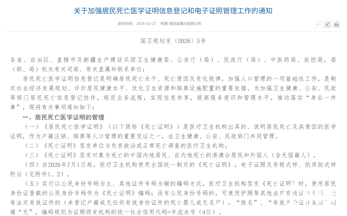 PChome 2月27日消息,据央视新闻报道,国家卫生健康委、公安部、民政部、国家中医药局、国家疾控局五部门联合发布《关于加强居民死亡医学证明信息登记和电子证照管理工作的通知》,部署建设全国标准统一的居民死亡医学证明电子证照信息系统。