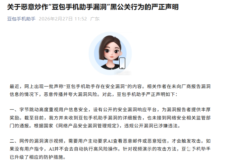 PChome 2月27日消息,针对网络流传的“豆包手机助手存在安全漏洞”相关消息,豆包手机助手公众号官方发布严正声明,明确已针对相关场景完成了安全防护升级,同时指出此行为属于典型黑公关炒作,将保留追责权利。