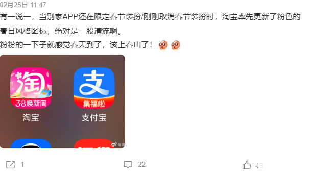 网友对于此次颜色改版的态度呈现两极分化,有用户认为浅粉色清新柔和,有春天的氛围,也符合节日的主题;也有用户觉得此番操作使软件辨识度下降、不易快速找到应用,并戏称“像是被太阳晒掉色”。