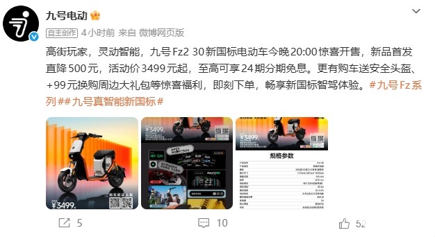 PChome 2月27日消息,九号电动正式推出Fz2 30新国标电动自行车,于今晚20:00全渠道开售,新品首发直降500元,首发售价3499元起,同步推出24期分期免息、购车送头盔、99元换购周边礼包等权益。