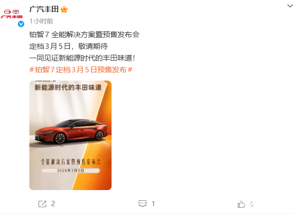 PChome 2月27日消息,广汽丰田官方宣布,旗下中大型纯电旗舰轿车铂智7将于3月5日正式开启预售发布会,主打20万级市场,号称“新能源时代的丰田味道”。