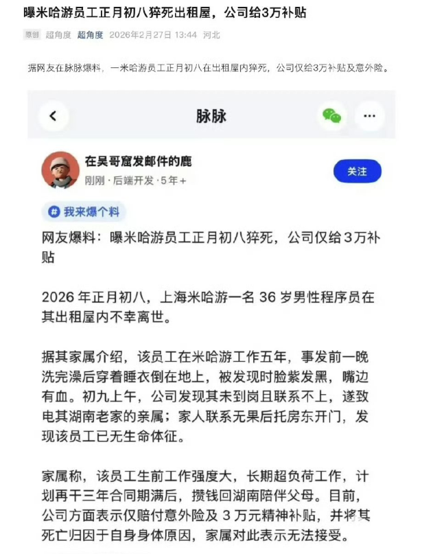 米哈游证实,一名2019年12月入职、在职超6年的员工,于2月24日春节后返岗复工,当日19:08正常下班,2月25日上午未参加早会、电话失联,公司便第一时间联系家属并报警,警方到场后确认该员工在其住所不幸离世。