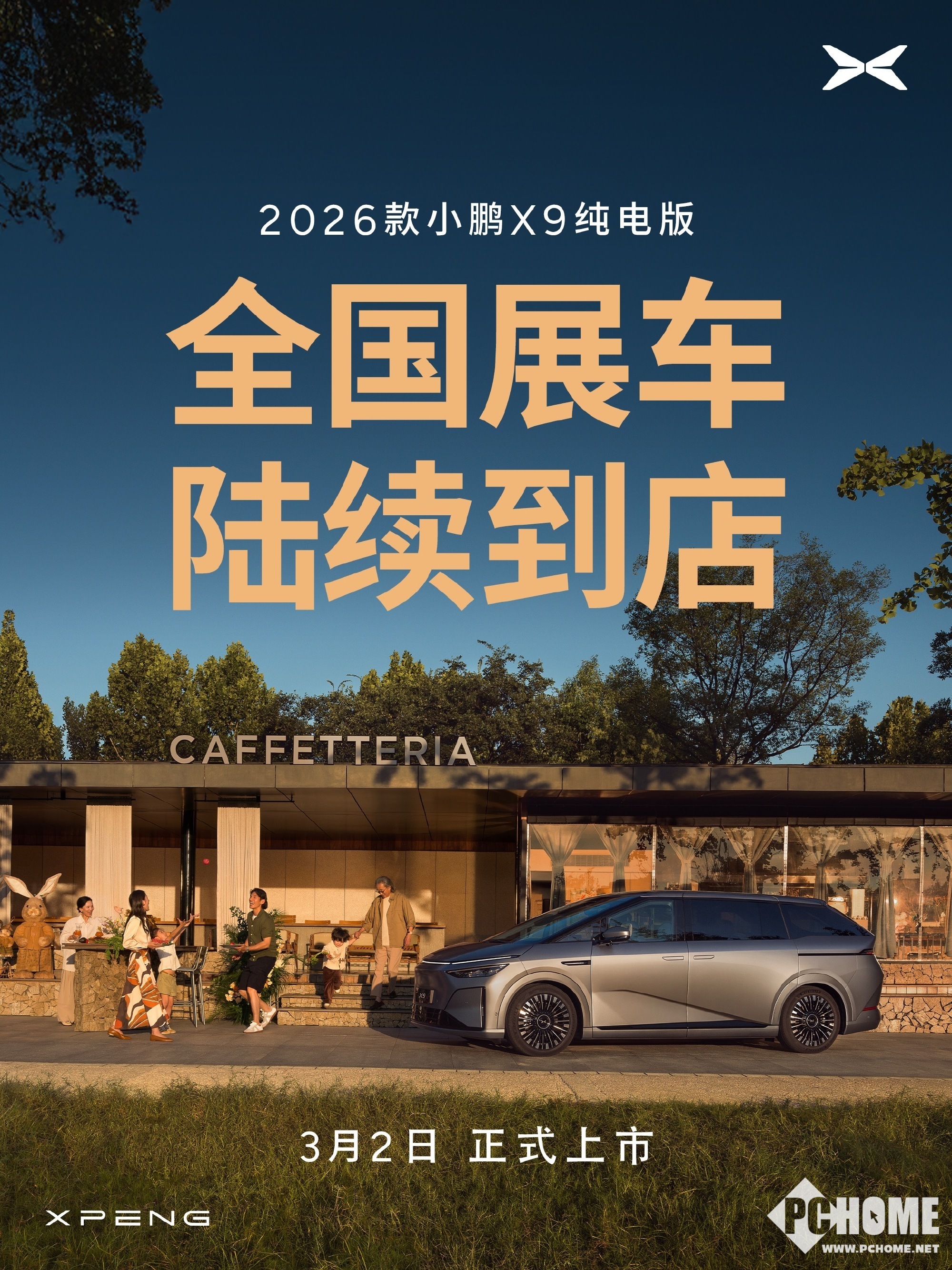 PChome 2月28日消息,小鹏汽车官微官宣,2026款小鹏X9纯电版全国展车已陆续到店,用户可到店品鉴。